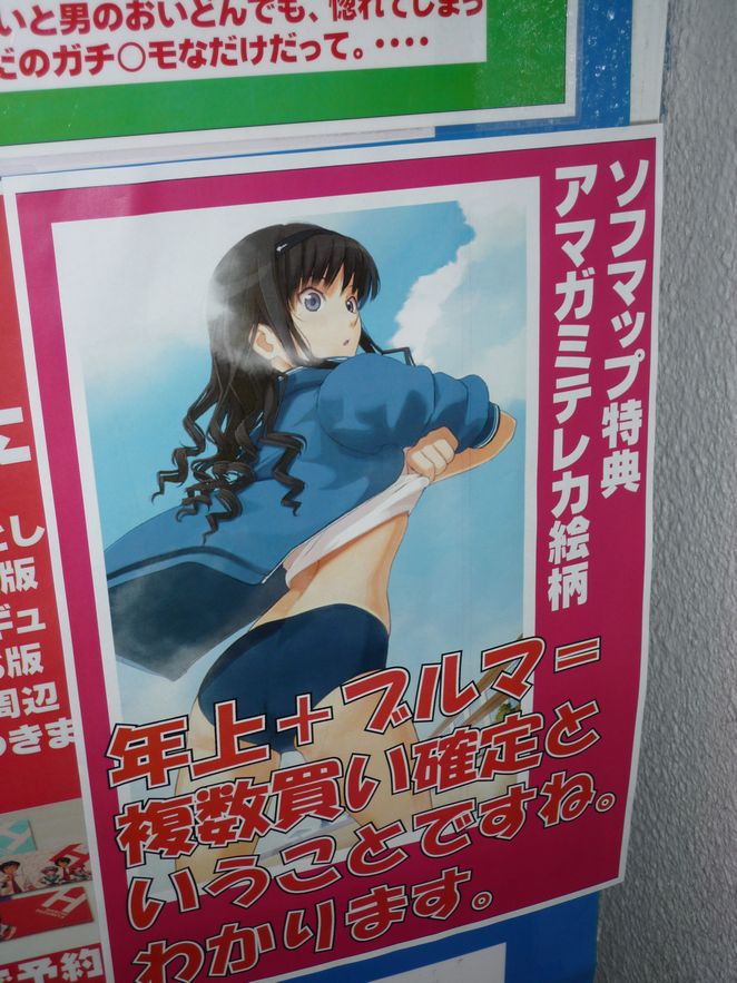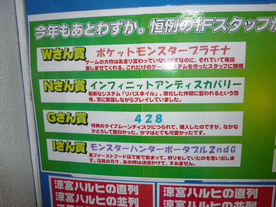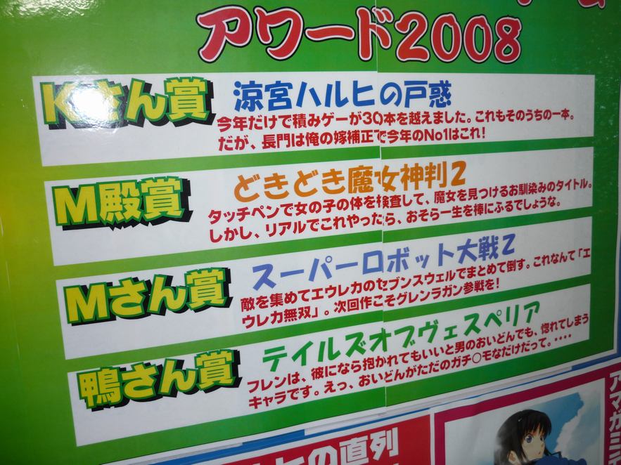 極端に少なくなっていることに気付きました。PSPやDSで屋外、主に通勤・帰宅時にプレイして いることが多く、家に帰るとPCの前に立ちひたすらBlog育成計画に没頭でした。 そんな2008年に発売された家庭用ゲームソフトは、キラ星のごとく発売されました。そんな大作、 名作、秀作、駄作。恒例となっている(らしい)ソフマップ・アミューズメント館の1階の店員が決める 「コンシューマーゲームアワード2008」が発表されていました。 ま、去年末あたりから掲載されていたので、ちょっと遅いですがご報告と言うことで。 ソフマップAM館・祖父店員は変態、マニア、ガチムチが揃っていることで有名ですが、基本的には えらくマジメに選んでるみたいです。 Wさん賞 ポケットモンスタープラチナ ゲームの大枠はあまり変わっていないはずなのに、それでいて毎回楽しませてくれる。これだけ のゲームシステムを作ったスタッフに脱帽。 Nさん賞 インフィニットアンディスカバリー 斬新なシステム「リバスネイル」。黒化した仲間に襲われると言う恐怖。常に緊張しながらプレイして いました。 Gさん賞 428 特典のタイプムーンディスクにつられて、購入したのですが、なかなかどうして面白かった。タマは とても可愛かったです。 Iさん賞 モンスターハンターポータブル2ndG 某ファーストフード店で皆で集まって、狩りをしていたのでを思い出します。店員の方々、あの時は 迷惑かけて、すみません。 Kさん賞 涼宮ハルヒの戸惑 今年だけで積みゲーが30本を越えました。これもそのうちの一本。だが、長門は俺の嫁補正で 今年のNo1はこれ! M殿賞 どきどき魔女神判2 タッチペンで女の子の体を検査して、魔女を見つけるお馴染みのタイトル。しかし、リアルでこれ やったら、おそら一生を棒にふるでしょうな。 Mさん賞 スーパーロボット大戦Z 敵を集めてエウレカのセブンスウェルでまとめて倒す。これなんて「エウレカ無双」。次回作こそ グレンラガン参戦を! 鴨さん賞 テイルオブヴェスペリア フレンは、彼になら抱かれてもいいと男のおいどんでも、惚れてしまうキャラです。えっ、おいどんが ただのガチ○モなだけでだって。・・・・ 祖父店員は、毎日、夜遅くまで仕事してるのにちゃんとゲームもしてるんですね。ご苦労様です。 しかも、評価もなかなか面白い。鴨さんって、どの人なんだろう。ちょっと、ガチホモっぽい人でも 探してみようかな。 既にアキバBlogさんやアキバOSさんにも取上げられていますが、「アマガミ」のソフマップ特典 テレカ。 ・・・。どういうシチュエーションで体操着を脱ごうしているのか?ブルマも絶滅危惧種だし。 [関連記事] IOSYS店員、今年の聖なる夜’も’愛するあの娘と大ハシャギ ソフマップAM館・6F入口で裸エプロンでお出迎え とらのあな本店 店頭に”パンツじゃないから恥ずかしくないもん” オモローPOP 「IOSYS」&「TAIRYO」 はやくも最新作 とらのあな1号店 店頭で乳対決勃発!しかし、結果は明白!? PCジャンクショップ”TAIRYO(大漁)” 早くも新作POP PCジャンクショップ“TAIRYO(大漁)” 毒づくPOP復活! ”らき☆すた”高良みゆきさんが不人気呼ばわりされて毒付く 重度の釘宮病患者が店長を務めるお店、出現! ”俺の嫁(処女)”が800円で売られていた エヴァンゲリオンのサブタイトルのようなロッカー登場 IOSYS、完全掃討作戦・夏の陣開催!攻めは、前門or後門? ソフマップは、GW中は”漢祭”開催中だ!! IOSYSの値段を下げる為に”風子”参上!! とらのあな本店前に破廉恥なおっぱいミサイル配備! とらのあな本店・店頭に「ToLOVEる」コスプレ衣装展示 アソビットG、今度は「つよきす 2学期」グッズ大量展示! ソフマップAM館に完璧超人、潜伏中!! IOSYS店員のカミングアウト!”小っちゃい子が好きだ!” 祖父店員、釘宮病なおらず!「ウホッ!いいゲーム」 揉まずに後悔より揉んで納得!! 今度は、ときめくフルーツ3つ ギレン閣下からアイマスプロデューサー達への演説 日本人を名乗る皆さん、お願いがあります キミキス 廉価版発売 祖父店員暴走気味あぶれいく ”スージー”ファンならアソビットで予約だ! バレンタインデーは、ソフマップでエロゲ購入! スカートの裾をおさえてみるけど竜巻相手じゃ意味が無い♪ 今度は、等身大ベッドシーツカバーというの名の川にダイブ!!! 罵煉多淫 IOSYS店員の恋人達への反抗 週末に”全て展示予定”のToHeart2私物展示完成度98.5% アソビット店員は、ToHeart2のおかげ(せい)で破産寸前!!! タマ姉ぇと結婚の準備をしてみた!! 「らき☆すた ~陵桜学園 桜藤祭~」発売当日のアキバの様子 アキバの各エロゲ店舗でプリケツ触りたい放題 秋葉原エロゲスタンプラリー開催! アキバで成人と認められたければ、エロゲ買え!! E‐1グランプリ開催!この日、アキバはカーニバルに! けしからん!また、オパーイ丸出し展示 けしからん!実にけしからん、このおっ○い丸出しは、けしからん! 足フェチよ!本店に集え!そして、このテレカを手に入れよ! PR