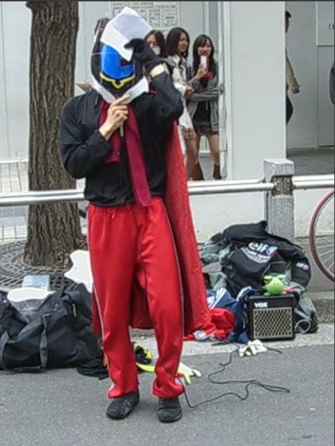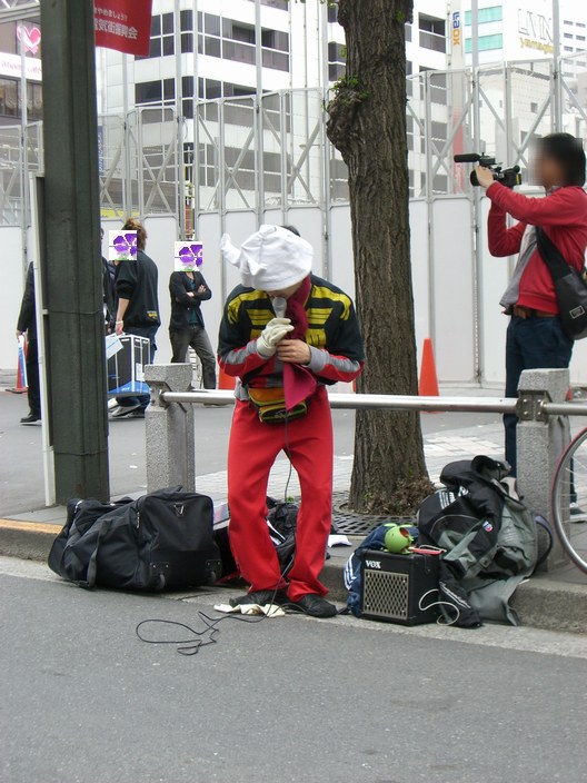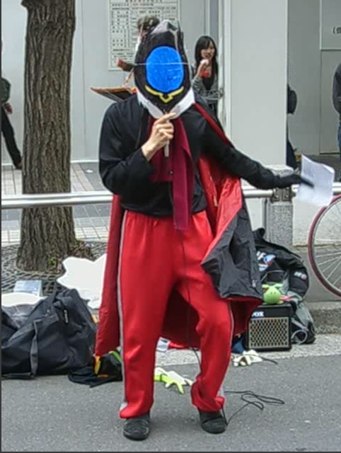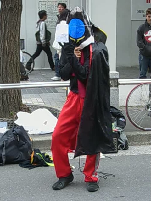おっと、大人気放映中の「コードギアス R2 反逆のルルーシュ」に登場する反逆の貴公子 ”ゼロ”が降臨しました!! 黒の騎士団というテロリスト集団のカリスマであり、ルルーシュ・ランペルージュが仮面を被って、 正体を偽った姿が”ゼロ”です。 ”ゼロ”は、一度だけ相手に無理やり命令を実行させる能力”ギアス”を持っており、左目で相手の 目を合わせることで実行できます。 そんな”ゼロ”がアキバの現状を変える為に?降臨しました。 「情報ライブミヤネ屋」でも出演していた「船橋のシャア」こと”ウェルダン穂積”さんのいつもの演説 お前達は、生きろ!!