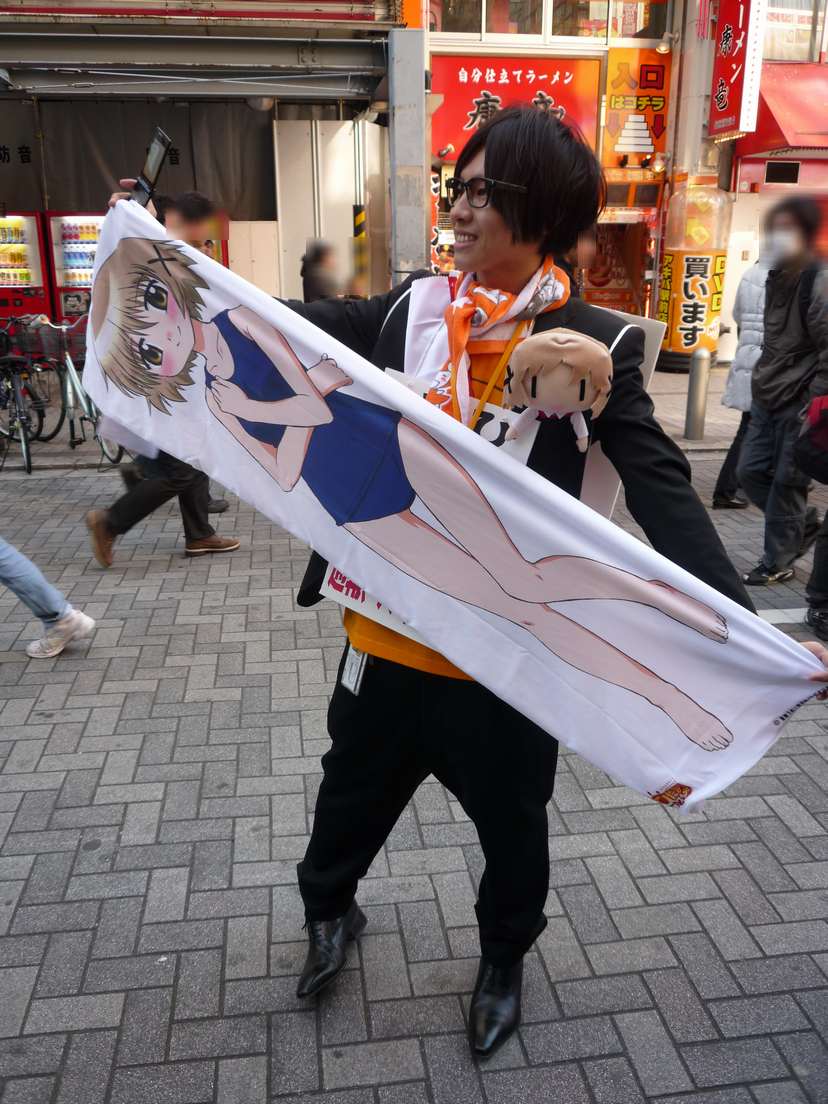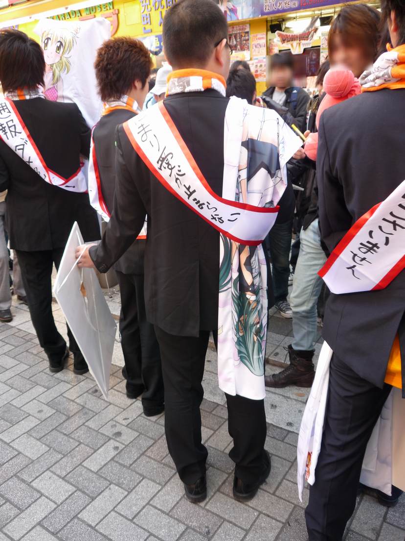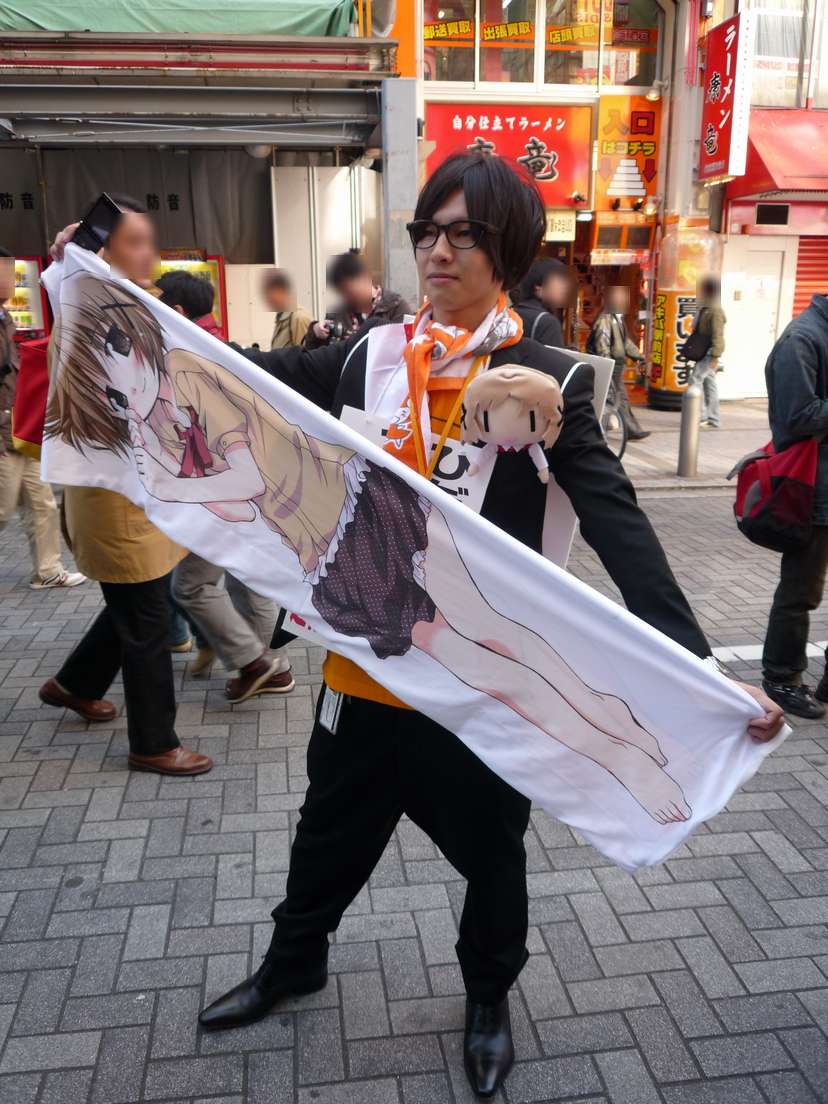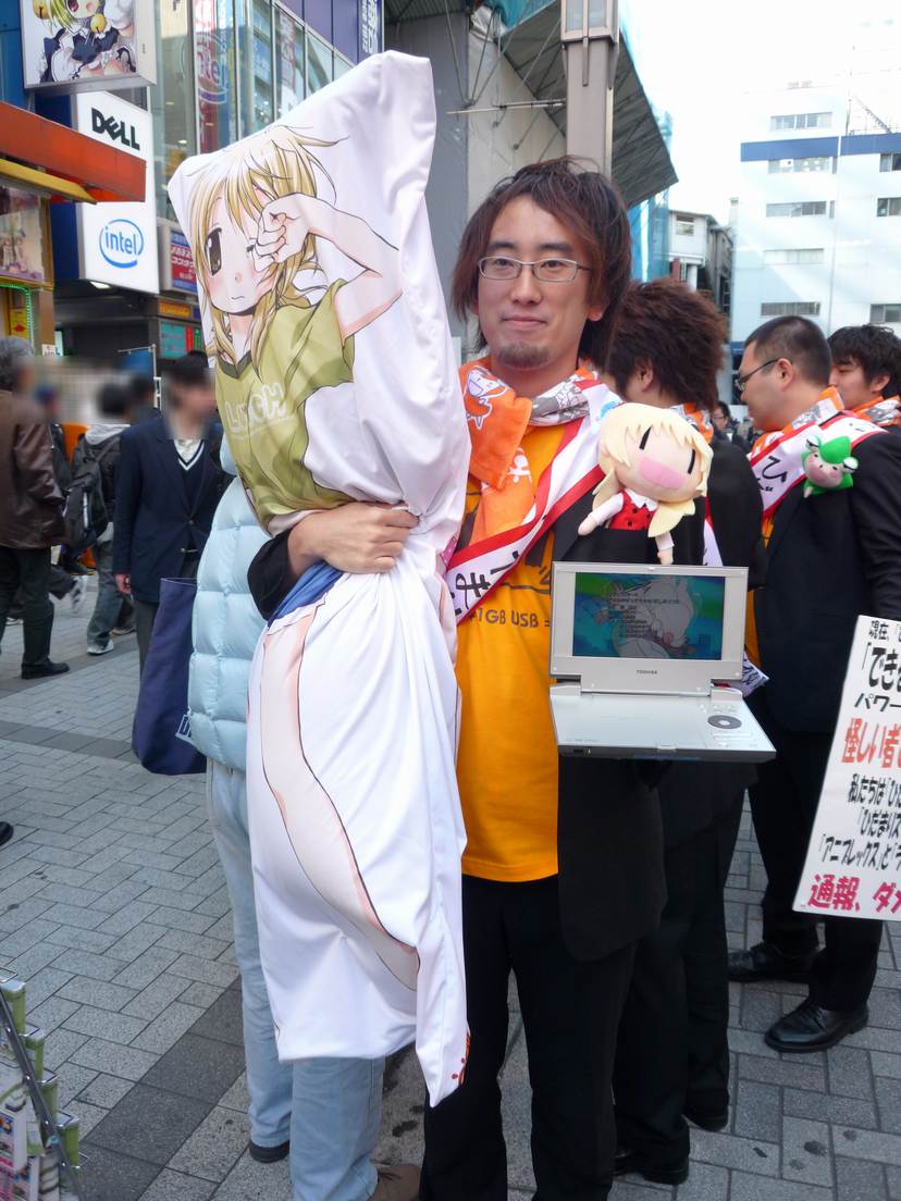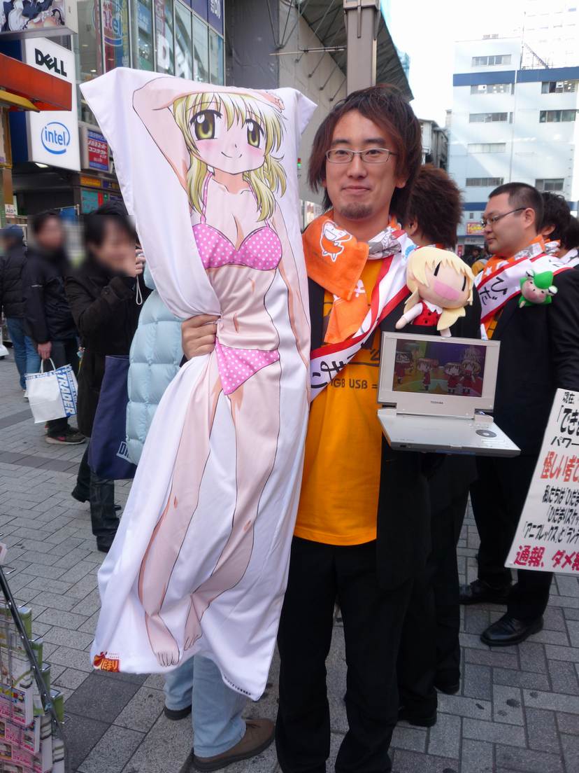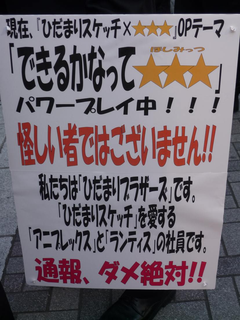 お昼頃にプラッとアキバへ行って見たらゲーマーズ本店店頭前辺りに抱き枕を抱えた怪しい人物 を発見!! なっ、なんだ?久しぶりに変な人がアキバに降臨してしまったのか?と思って、ちょっとwkwkして 近付いて見ると、抱き枕とは不釣合いの黒のスーツを着た集団がなにやらアンケート?署名活動? と思われるようなことをしており、あからさまに怪しい・・・・。しかも、全員、抱き枕カバーを腰などに 巻いてるし・・・・。 と、よーく見て見るとなにやらメッセージの書かれたボードを持っている! 「 ”ひだまりスケッチ”を愛する”アニプレックス”と”ランティス”の社員です。 通報、ダメ絶対!! 」 うぉっ、アニプレックスとランティスの社員だ! どうやら、先日発売になった”ひだまりスケッチ×”のOP曲「できるかなって☆☆☆」の宣伝の ためにアキバ仁来ていたみたいで、みんな”ひだまりスケッチ×”の黒いスーツで身を包み、 抱き枕カバーを腰、肩に装備して、少し怪しい感じだった。 一応、怪しいことを自覚しているみたいで「怪しい者ではございません!!私たちは「ひだまり ブラザーズ」です。「ひだまりスケッチ」を愛するアニプレックスとランティスの社員です。 通報、ダメ絶対!!」というボードを持って、万世橋署への通報を阻止していました。 また、”ひだまりスケッチ×”のOP曲「できるかなって☆☆☆」の宣伝として、ゲーマーズ前を 歩く人たちから”ひだまりスケッチ×”に対する熱いメッセージを募集していて、特製ボードに熱い メッセージを書いてもらっていた。 「怖がらずに声を掛けてみよう」 ということで、怖がらずにランティス・アニプレックスの社員に声を掛けて、撮影させてもらいましたw で、あからさまに抱き枕の裏側(水着姿)を隠しながら宣伝していたので、裏側を表にして撮影させて もらいました。万世橋署、来なくて良かったw ブログ掲載についても「じゃんじゃん、上げてちゃってください」って、ノリノリでしたw もう、一方。 こっちは、裏側はスク水。 「だっ、大丈夫かなぁ?」と心配しながらスク水抱き枕カバーを誇らしげに掲げてくれましたw と、まさかの羞恥プレイ中のアニプレックス・ランティスの社員さんがいらっしゃいました。 つか、普通にスーツ着て、抱き枕・・・大変だなぁー。つか、みんなノリノリだったのがひだまり スケッチへの想いはガチなんだろうなぁー、と。 [関連記事] 「リア充自爆シロ!!」「鶯谷に行けよ!」、アキバ今年もクリスマス中止 「メイドさぁーーん、パンツ見せてぇー」、見事にゆとりなバカ行動 アキバに縞パンを露出した女性降臨!? 縞パンさいこー! PR
