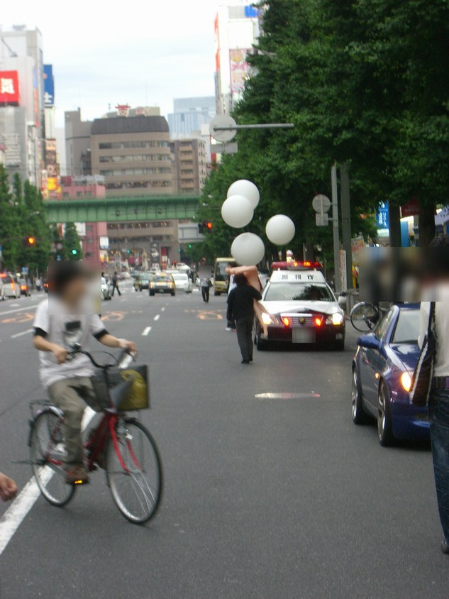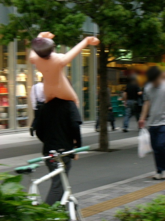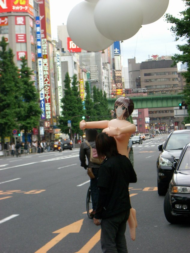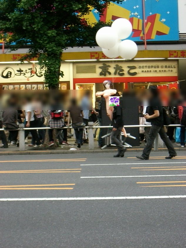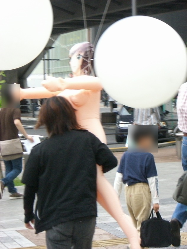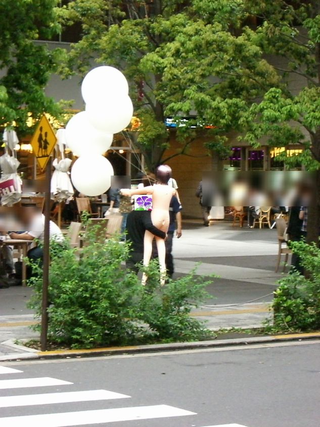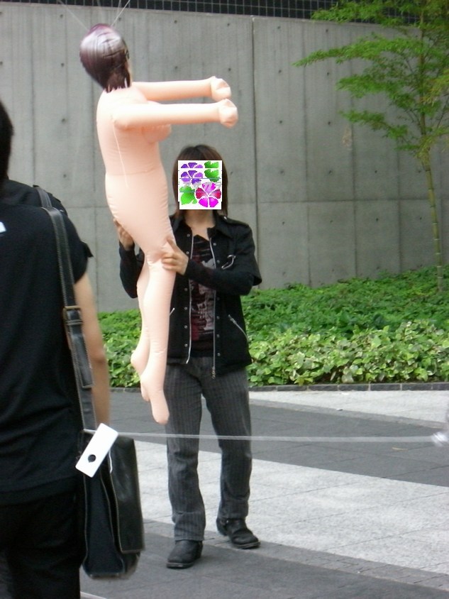 今週のアキバは、土曜日から雨が降り日曜日のホコテンは開催されないだろうと、思っていました。 前日から降り続いていた雨も上がり、お昼には道路も少し乾いたところが見えるぐらいに持ち直し、 ホコテンは開催されませんでしたが、とりあえずアキバに行ってみました。 アキバの獣人がJR秋葉原駅前でたむろっていたので、とりあえず近づくのを止めて色々とショッピ ングを楽しんで、6時ごろに帰ろうと思い横断歩道を渡ろうとしたその時、横断歩道の向こうに 全裸の女性?を抱えた男性を発見!! もちろん、本物の女性ではなく、風船をつけたラブドール(奪痴人妻)です。 しかも、男性はこんな恥ずかしいモノを抱えたまま、アキバの街を闊歩しており、パトカーの前も 堂々と素通り。 過去にもラブドールを抱えてデートしていたイケメン男性がいらっしゃいましたが、その時はラブドール に服を着せており、今回の様にまっぱではなかった。 UDX前のカフェでくつろいでる方々も奇異の目を向けていました。また、見かけたアウェイの方々が 笑いながら彼に着いて行きデジカメで撮影を行う人が多くいらっしゃいました。 いきなり、肩車をしたり 雑に引きづったり、 局部を晒しながら抱えたり、 と、さまざまなプレイをしながらアキバの街を歩いておられました。 過去に見た方同様、ラブドールを必要ないようなイケメン風な方で、またなにかの罰ゲームが執行 されているのかも。 やはり、男性一人でプレイを楽しんでいたわけではなく、数人の男性がラブドールを膨らませる 為の空気入れ(ガス管?)を持って男性をフォローしていらっしゃいました。 もしかすると、ラビドールの宣伝なのかもしれませんが・・・。さすがに服は着せた方がいいと思う んですけど・・・・。 [関連記事] アキバで究極のデートを楽しみイケメン アキバの公衆の面前でセック○をたのしむアーティスト PR
