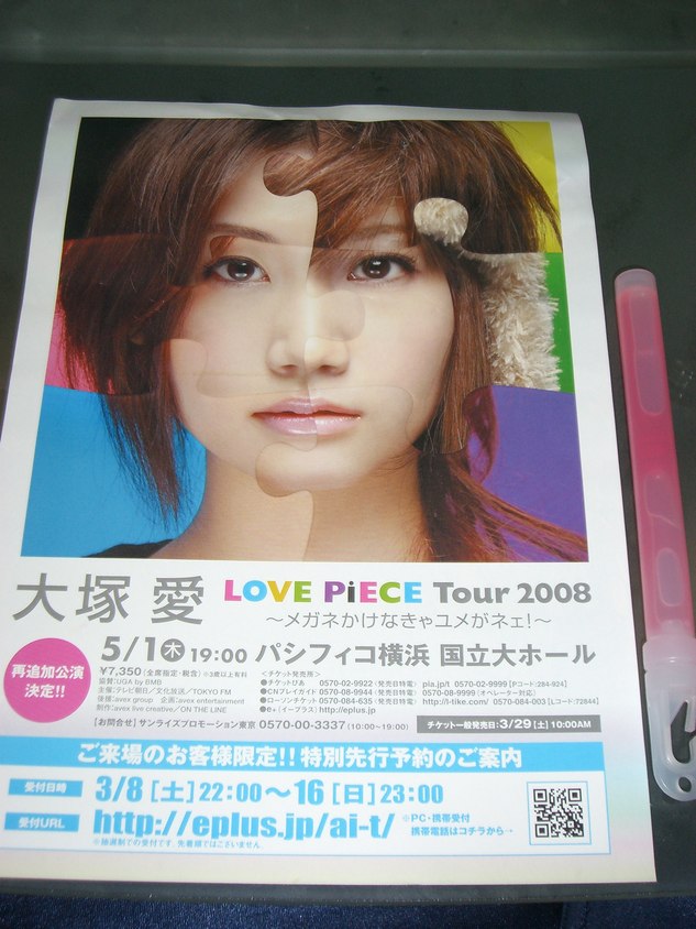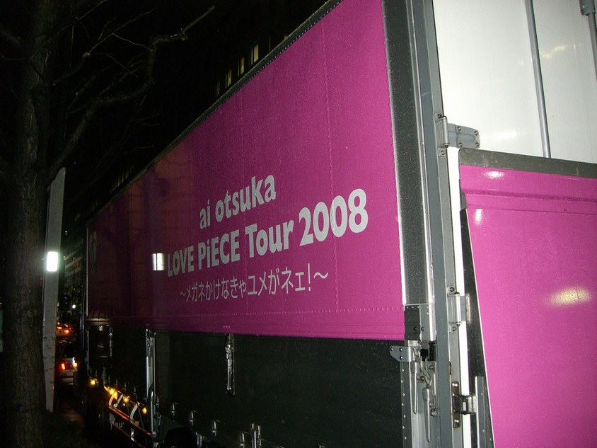 数少ない友人と共に東京国際フォーラムで開催された「ai otsuka LOVE PiECE Tour 2008 ~メガネかけなきゃユメがネェ!~」に 行ってきました。 現在、大塚愛さんは2月2日から5月6日にかけて東京・大阪・名古屋・富山・広島・岡山・兵庫・静岡 ・新潟・福岡・宮城・岩手・香川・北海道・大分・熊本・愛知・神奈川を周る全国ツアーを行っている。 この日は、あいにくの雨だったが金曜日の夜というのもあって完全満員御礼だったみたい。 年に3・4回ぐらいしかアーティストのLIVEには行かないのですが、今回、友人から欠席者がでた ということで、チケットをもらい東京国際フォーラムのAホール1階16列目という、かなりの好席で 大塚愛さんの歌声を聴くことが出来ました。 私は、大塚愛さんのファンと言うわけではないのですが、「プラネタリウム」「ユメクイ」が大好きで 今でもヘビーローテーションで聴いています。さすがにアルバム収録曲などまで聴いていなかった のですが、今回のLIVEはヒット曲が多いせいか、どの曲もノることができました。 「さくらんぼ」や「恋愛写真」、「PEACH」を聴くことが出来、ニワカとしてかなり満足。なにより、 「プラネタリウム」の生歌はかなり、感動。大塚さんの声が染み渡りました。 ヲタクなので、最初は曲ごとの簡単な振り付け(ジャンプとか)やペンライトを振るなどをぜんぜん、 する勇気がなかったのですが終りに近づくにつれテンションが上がっていき、PVなど有名になった 「CHU-LIP」の振り付けやこの日、オリジナルの振り付けなどを自然とできている自分がいました。 (ちょっと、自分でもびっくり) LIVEが終わったあとには、大塚愛さんがかなり好きになっていました。曲の合間に簡単なトークが 行われるんですが、関西弁がちょっと萌え。観客席を見回してみると、私のように会社帰りでスーツ を着た人は、すくなく、小中高生やカップルが多く、それでも大多数は20代の男性が多かったみたい です。もちろん、女性も。 しかし、初めてかもしれないなぁー、ペンライトを振ったりするの・・・。基本、私がいくLIVEはミスチル とかペンライトと縁のないのが多いんで・・・。(ちなみに声優LIVEなどは、いったことがありません) 最後に東京国際フォーラムを出たらこんな痛トラックが・・・。 単なるツアートラックですけどね。 本当に「プラネタリウム」を生声で聴けて幸せでした。また、行きたいと思ってしまいましたよ。ちなみに 次のツアー開催地は、新潟・・・・。 PR