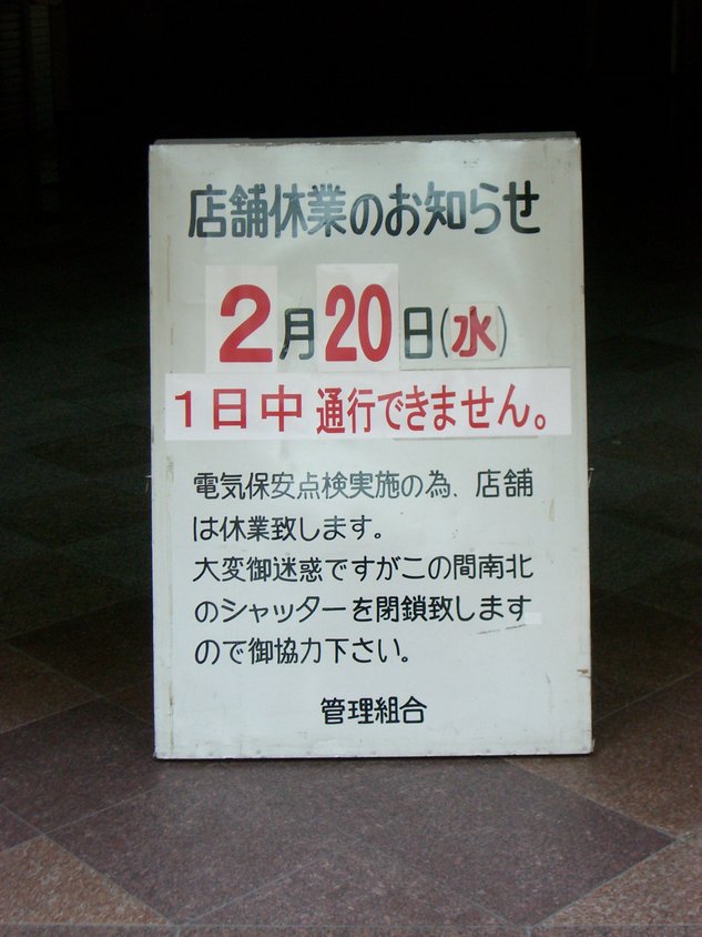 大好きな中野ブロードウェイを裸で1週する」とか発言したらしい。 そんな”しょこたん”とは、まったく関係ないのですが所用でその中野ブロードウェイに行ってきた のですが、なんか様子がおかしい。 中野は、いろいろとあらゆるジャンルのお店が集まっており、昼食時に言った為に中野BWへ続く 道すがら、あちこち回っていたら着いたのが中野に来て1時間後・・・orz と、中野BWについてみたらこんな感じだった。 えっ、閉店? 入り口が真っ暗になっており、普段の中野BWの光景とは思えない。中野BWは、あらゆるジャンル のテナントが入っており、衣食住+趣味とここにいれば生活にこまらない空間になっています。 ゆえに中野BWの灯が消えているのはありえない、と思っていたのですが・・・。 どうも、電気点検のために丸1日全店舗が閉まっていたみたい。 周りの声を傾けてみると「せっかく着たのに」「中野BWって休みがあんの?」「暗いねぇ」と、店舗 が閉まっていることがあまり、知られていないこともあったのか、多くの人が困惑の表情をしてい ました。 もともと、中野BW自体が閉まっていることは珍しいらしいです。各店舗は、それぞれ定休日は バラバラでいっせいに休むことはないみたい。 この風景は、意外にレアなのかも。 閉まっているけど、柵などを設けられておらず強引に中に入っていく人もいました。 まぁ、ちょっと所要があったのに無駄足になってしまったって感じです。 [関連記事] こんなん買ってみました! らき☆○たグッズ? PR