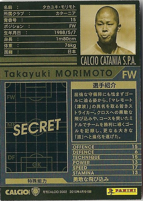 もちろん、「CALCiO2002」といえば、セリエA!セリエAといえば、そうアノ男!! CALCiOといえば、やっぱりジャンルカ・トト・富樫さん。知っている人は知っている、知らない人は まったく知らない、セリエAフリークの神様みたいな人で、CALCIOの初代編集長であり、イタリア サッカーおよび、アフリカサッカーをこよなく愛し、その生涯をサッカーにとともに過ごした偉大な サッカーフリークです。まじめに、サッカー好きとして本当に尊敬している人です。 2006年にお亡くなりになっているんですが、アフリカネイションズカップの取材でエジプトのホテル でお亡くなりになって、本当にサッカーと共に生きた、ある種羨ましい最後を打と思います。 そんな、ジャンルカ・富樫(本名富樫洋一)さんがセリエAを知ってもらうために発行したCALCiOの 付録としてWCCFカードが付録として付いてきました! つか、正直、カルチョをかったの久しぶり。やっぱり、今のご時世、セリエAオンリーの情報しか載って いないうえに、800円もするのはちとキツイw 前回買ったのは、WCCFカード・アドリアーノが付録と してついてきた時・・・・。セリエAのこだわりすぎて、内容が異様に濃い雑誌なんですけどね。 で、今回の付録カード、何故か07-08のパッケージ。 そして、付録カードの内容は、WCCFファン待望の! タカユキ・モリモト 15/6/15/13/17/13/79 勇敢な飛び込み カードデザインは、07-08で、やっぱり07-08の能力で作られてるみたい・・・・。つか、もうちょっと 高いでしょ・・・・。08-09が一番評価されていたんで、今Verなら16/6/15/15/17/14/83ぐらい あってもおかしくないと思うんですけど・・・。 コメントは、 「屈強な守備陣にも怯まずゴールに迫る姿から「マレモート(津波)」の異名をとる若きストライカー。 クロスへの果敢な飛び込みや、コースを付いたミドルでチームを勝利に導くゴールを記録し、 更なる大きな「波」へと進化を遂げた」 うーん、使いづらいなぁー。なんで、こんな使いづらいカードにする必要があるんだろう。日本人 補正をかけてくれてもいいのに・・・。 ちなみに、カルチョはこういうちょいとエロい情報まで掲載しているから好きです。 海外のサッカー選手って、こういうモデルと密接な関係な人が多いから、こういう情報もあるんで すよねー。 ということで、相変わらず使えるのか使えないのかわからないカードになっていますが、まぁ、 森本なんでデフォで購入ですね。 最後に注目すべきことがこの言葉。 "WCCFカード 第1弾" うふふ、ということは・・・・・・、おさらくですが小笠原と大黒あたりがカード化されそうですねw [関連記事] WCCF ワーサカ・オリジナルカード企画 発動!今回は、元ジェフの王子様 WCCF08-09 エクストラキャンペーン開始!また、白オンリー WCCF08-09 アキバ・新宿・中野奮闘記 第12回 WCCF08-09 アキバ・新宿・中野奮闘記 第11回 WCCF08-09 アキバ・新宿・中野奮闘記 第10回 WCCF08-09 アキバ・新宿・中野奮闘記 第9回 WCCF08-09 アキバ・新宿奮闘記 第8回 WCCF08-09 アキバ・新宿奮闘記 第7回 WCCF08-09 アキバ・新宿奮闘記 第6回 WCCF08-09 アキバ・新宿奮闘記 第5回 WCCF08-09 アキバ・新宿奮闘記 第4回 WCCF08-09 アキバ・新宿奮闘記 第3回 WCCF08-09 新潟奮闘記 第2回 WCCF08-09 アキバ・新宿奮闘記 第1回 WCCF '08-09 レアカテゴリー最新カード紹介!! コネェ━(゚A゚;)━!! ワーサカ特典カード、ついに日本人DFカード化 待ってた!レフティーモンスター2世、カード化!ただ、能力は残念! WCCF07-08 新潟奮闘記 第13回 WCCF07-08 アキバ・新宿奮闘記 第12回 WCCF07-08 アキバ・新宿奮闘記 第11回 WCCF07-08 アキバ・新宿・中野奮闘記 第10回 WCCF07-08 アキバ・新宿・中野奮闘記 第9回 WCCF07-08 アキバ・新宿奮闘記 第8回 WCCF07-08 アキバ・新宿奮闘記 第7回 WCCF07-08 アキバ・新宿奮闘記 第6回 WCCF07-08 アキバ・新宿奮闘記 第5回 WCCF07-08 アキバ・新宿奮闘記 第4回 WCCF07-08 アキバ・新宿奮闘記 第3回 WCCF07-08 アキバ・新宿奮闘記 第2回 WCCF07-08 アキバ・新宿奮闘記 第1回 WCCF07-08 カードリスト未完成Ver 公開!(速報!!) WCCF07-08 続報!!レアカテゴリーカード、1部公開! 大きくなって帰ってきた魔法の左足がワーサカキングでカード化 ル・マンのソレイユ、ついにワーサカキングでWCCFカード化! WCCF07-08 ついに公開!最新選手カード紹介! WCCF07-08 ついに確定情報GET!注目の稼動時期は? WCCF06-07 奮闘記 第15回&次期Ver妄想 WCCF、早くも時期Verのロケテ開始!参戦クラブを妄想! WCCF06-07 アキバ・新宿奮闘記 第14回 WCCF06-07 アキバ・新宿奮闘記 第13回 WCCF06-07 アキバ・新宿奮闘記 第12回 WCCF06-07 新潟・アキバ・新宿奮闘記 第11回 WCCF06-07 アキバ・新宿奮闘記 第10回 WCCF06-07 アキバ・新宿奮闘記 第9回 WCCF06-07 アキバ・新宿奮闘記 第8回 WCCF06-07 アキバ・新宿奮闘記 第7回(綺羅プレゼント) WCCF06-07 アキバ・新宿奮闘記 第6回 WCCF06-07 アキバ・新宿奮闘記 第5回 WCCF06-07 アキバ・新宿奮闘記 第4回 WCCF06-07 アキバ・新宿奮闘記 第3回 WCCF06-07 アキバ奮闘記 第2回 WCCF06-07 アキバ奮闘記 第1回 WCCF06-07、カードリスト(未完)