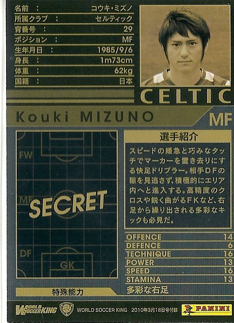 オリジナルカードの企画が早くも発動されましたw まぁ、前回の付録が2009年の7・8・9月と3回連続されていたんですが、半年しか経っていないの に早くも登場。つうことは、よろっと新Verが・・・・・・・・・んなわけないか。 前回は、長谷部、本田、宮本と3人の日本人選手がカード化されていましたが、今回はどんな選手 がカード化されていくのか・・・・、めっさ楽しみw とうことで、今号のオリジナルカードは? 元ジェフ千葉、現セルティックの水野晃樹。 今季の出場がまだ、たったの1試合の選手のカード化か・・・・。まぁ、現在の海外で活躍する日本人 が少ない状況じゃ、ぶっちゃけ試合出場が少なくてもカード化せざる得ない状況ってことでしょうか・・・。 今季、海外でプレイしている日本人は、俊輔・本田・長谷部・森本・松井・鈴木規・小林大・吉田・伊藤・ 相馬、ここから明確にチームの戦力としてプレイしていたのは、本田・長谷部・森本・松井・小林大 ぐらい・・・・。(韓国選手の海外での活躍を見ると悔しくなります) で、水野の能力ですが、 14/6/16/13/16/13 /78 多彩な右足 となっています。 選手紹介には、「スピードの緩急と巧みなタッチでマーカーを置き去りにする快速ドリブラー。 相手DFの隙を見逃さず、積極的にエリア内へと侵入する。高精度のクロスや鋭く曲がるFKなど、 右足から繰り出される多彩なキックも必見。」 となっている。 ま、こんなもんでしょう。セルティックでまったく出場できてない以上、これでも高い方かな・・・・。 ぶっちゃけ、かなり期待していた選手なので、プレイの安定度さえ増せば十分に海外で活躍できる 選手だと踏んでいたんですけど、海外は早すぎたのかな? さて、次号の選手は、やっぱ森本かな・・・・・。しか、いないでしょう。 本田は、VVV出しか出せないだろうから無理だろうし、俊輔ってのもあるかもなぁー。有力候補は、 森本として、次点としては小林大か、宮本の例を見て三都主と高原かな。高原のカード化して 欲しいけど。 [関連記事] WCCF08-09 エクストラキャンペーン開始!また、白オンリー WCCF08-09 アキバ・新宿・中野奮闘記 第12回 WCCF08-09 アキバ・新宿・中野奮闘記 第11回 WCCF08-09 アキバ・新宿・中野奮闘記 第10回 WCCF08-09 アキバ・新宿・中野奮闘記 第9回 WCCF08-09 アキバ・新宿奮闘記 第8回 WCCF08-09 アキバ・新宿奮闘記 第7回 WCCF08-09 アキバ・新宿奮闘記 第6回 WCCF08-09 アキバ・新宿奮闘記 第5回 WCCF08-09 アキバ・新宿奮闘記 第4回 WCCF08-09 アキバ・新宿奮闘記 第3回 WCCF08-09 新潟奮闘記 第2回 WCCF08-09 アキバ・新宿奮闘記 第1回 WCCF '08-09 レアカテゴリー最新カード紹介!! コネェ━(゚A゚;)━!! ワーサカ特典カード、ついに日本人DFカード化 待ってた!レフティーモンスター2世、カード化!ただ、能力は残念! WCCF07-08 新潟奮闘記 第13回 WCCF07-08 アキバ・新宿奮闘記 第12回 WCCF07-08 アキバ・新宿奮闘記 第11回 WCCF07-08 アキバ・新宿・中野奮闘記 第10回 WCCF07-08 アキバ・新宿・中野奮闘記 第9回 WCCF07-08 アキバ・新宿奮闘記 第8回 WCCF07-08 アキバ・新宿奮闘記 第7回 WCCF07-08 アキバ・新宿奮闘記 第6回 WCCF07-08 アキバ・新宿奮闘記 第5回 WCCF07-08 アキバ・新宿奮闘記 第4回 WCCF07-08 アキバ・新宿奮闘記 第3回 WCCF07-08 アキバ・新宿奮闘記 第2回 WCCF07-08 アキバ・新宿奮闘記 第1回 WCCF07-08 カードリスト未完成Ver 公開!(速報!!) WCCF07-08 続報!!レアカテゴリーカード、1部公開! 大きくなって帰ってきた魔法の左足がワーサカキングでカード化 ル・マンのソレイユ、ついにワーサカキングでWCCFカード化! WCCF07-08 ついに公開!最新選手カード紹介! WCCF07-08 ついに確定情報GET!注目の稼動時期は? WCCF06-07 奮闘記 第15回&次期Ver妄想 WCCF、早くも時期Verのロケテ開始!参戦クラブを妄想! WCCF06-07 アキバ・新宿奮闘記 第14回 WCCF06-07 アキバ・新宿奮闘記 第13回 WCCF06-07 アキバ・新宿奮闘記 第12回 WCCF06-07 新潟・アキバ・新宿奮闘記 第11回 WCCF06-07 アキバ・新宿奮闘記 第10回 WCCF06-07 アキバ・新宿奮闘記 第9回 WCCF06-07 アキバ・新宿奮闘記 第8回 WCCF06-07 アキバ・新宿奮闘記 第7回(綺羅プレゼント) WCCF06-07 アキバ・新宿奮闘記 第6回 WCCF06-07 アキバ・新宿奮闘記 第5回 WCCF06-07 アキバ・新宿奮闘記 第4回 WCCF06-07 アキバ・新宿奮闘記 第3回 WCCF06-07 アキバ奮闘記 第2回 WCCF06-07 アキバ奮闘記 第1回 WCCF06-07、カードリスト(未完)をまとめてみました PR