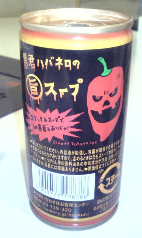 ”暴君ハバネロ 旨スープ” という缶ジュースが販売されています。 ということで、辛いものが大の苦手な私としては罰ゲーム感覚でこの 缶ジュースを飲んでみました。 冠の裏には、”サンドウィッチやおにぎりとごいっしょに”と書いて あったのですが、あえてオンリーでチャレンジ! 以前、某カラオケ屋で”ロシアンルーレットおはぎ”なるものにハバネロ が混入されていて、食したことがあるのですが、もう悶絶するほどの 辛さを体験し、「こんなもん、食いもんじゃない!!」と、思いましたが・・。 紙コップに注いでみると なんか、コンソメスープが少し赤いぐらい。 しかし、匂いはチリソースっぽい。 一口含もうと、飲もうとした瞬間、匂いを口から吸い込んでしまい、 すさまじく辛い匂い?味?する!! 一挙に腰が引ける!! しかし、飲まないわけにいかないので勇気を振り絞って、飲んでみる! !!!!!!!! 普通! 全然、辛くない!唐辛子を入れた方がよっぽど辛い、と感じるほど 全然、辛くない。暴君ハバネロの威光すら感じられない。 まったく、ガッカリな結果ですが、ちょっとJAROに電話しようかと 思うようなだまされた気分です。 ちなみに”旨いかどうか?”というのは、チリソースを薄めた感じ だったので・・・・人によりけりかも・・・・。 [関連リンク] 「暴君ハバネロの旨スープ」を販売している自動販売機@秋葉原 秋葉原マップさん PR