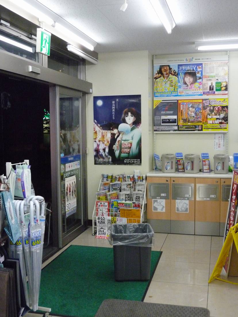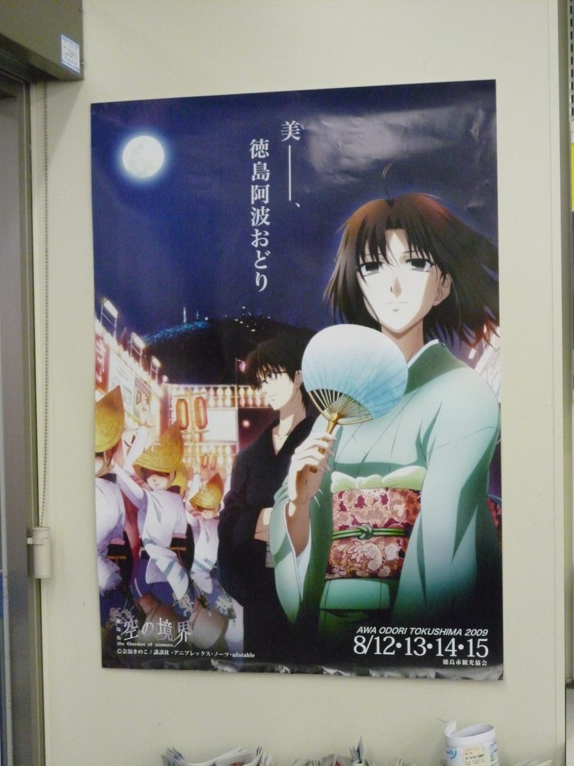 って記事があって、徳島じゃあ無防備にこんなレアリティの高いポスターが貼ってあるのか?と 驚いていたんですが(まぁ、いくらアニメポスターでも無闇に剥がしてもちかえろうなんて思いませんが) そんな徳島の阿波踊りPRの為に作られた「空の境界」のポスターが東京、しかも虎ノ門というアニメ とは無縁の場所で無防備に?張られている場所を見つけました! 見つけた!と言うのは少し語弊がありそうなので、正確には、友人から虎ノ門で徳島で盗難されま くって、ヤフオクで9万円で売買されている「空の境界」のポスター見つけた!という報を聞いたので、 友人に「じゃ、撮影してきて」って懇願したら、あっさり「なんで、お前なんかの為に」と返ってきたの で、自分の足で見に行ってみました(ひでぇ、友人だ) つうことで、東京の虎ノ門で見ることの出来る徳島市の阿波踊りPR「空の境界」ポスターがこちら。 そのポスターがある場所が実は、驚きのコンビニエンスストア・ローソン! 私も友人からローソンにある!って言われたときは、友人に「もうそろそろ、二次元とリアルの区別、 つけようぜ」って思ったのですが、友人からさらに詳しく聞いてみたらこの虎ノ門にあるローソン、 最近、巷ではやりの地方のアンテナショップとしても機能していて、近年、ローソンが地域密着の 一環としてこういった形態の店舗が増えているみたい。 そして、お分かりと思いますがこちらのローソンは”徳島県”の物産などを販売するアンテナショップ で、その一環として店内に1枚だけ阿波踊りPR「空の境界」ポスターが貼ってあるみたいです。 貼ってある場所は、店内にはいってすぐ横。 残念ながら、ドアのすぐそばと言うこともあり、寒暖の差や風などの影響を受けて、ポスターの状態は それなりに悪い。 ただ、東京都内でホンモノを見れる数少ない場所なのかな? 徳島の特産品を売る一角もあり、私が思い描いていたアンテナショップっぽかった。 コチラのローソン、ローソン虎ノ門巴町店で、虎ノ門駅から5分、神谷町駅から3分ぐらいのところ にある。気をつけなきゃいけないのは、虎ノ門の周辺には何故か?腐るほどローソンが一杯ある。 私が見つけただけで4店舗ぐらいあった。もちろん、デフォルトでこのローソンを見つけるまで、 時間がかかりニセモノをつかまされています。 つうことで、虎ノ門に御用がある方は、是非、行って見てください。徳島の特産品、私もちょっと 買ってきました。普通に物産目当てでもいいかも。 [関連記事] 新宿の仮面ライダーポスター群を見に行って見た PR