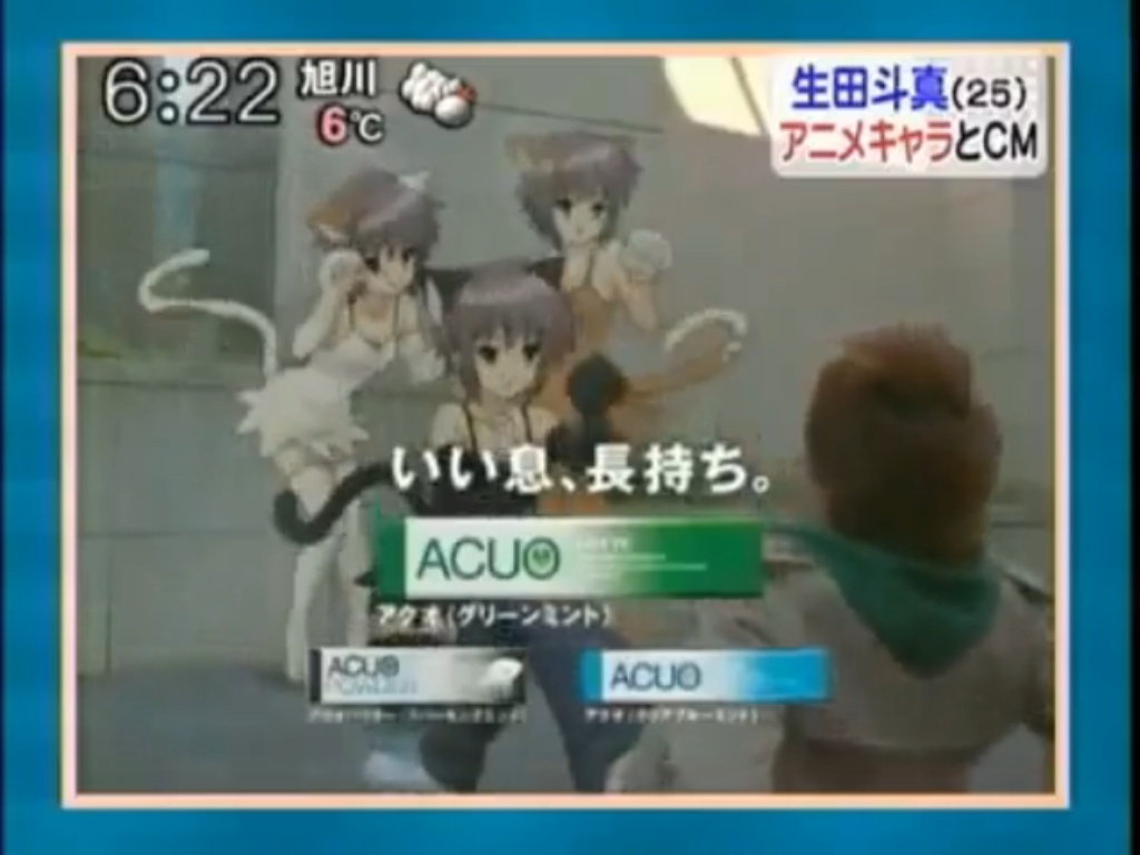 イケメン俳優に殺意を覚える内容とは・・・・。 4月5日から放送が予定されている涼宮ハルヒとロッテのコラボCM、朝の情報番組でそのCMの 内容が明らかになってみたいです。YOUTUBEにすでにうpされていたので、その動画をご紹介 ついでにハルヒと出演しているイケメン俳優への嫉妬から殺意を芽生えさせていただこうかと・・。 つか、長門有希の極悪なまでかわいさが日本全国のお茶の間の男性を瞬殺すること確定に 違いない。 今回のCMは、ロッテのガム・AQUO。登場するのは、涼宮ハルヒ・朝比奈みくる・長門有希の三人 で、イケメン俳優で知られる生田斗真と共演を果たしている。 内容は、AQUOを噛んで息を吹きかけた相手が二次元のアニメキャラに変わると言うもの。 店員と逆切れする女性に息を吹きかけるとそれぞれ、みくるちゃんとハルヒが登場する。息を吹き かけられたみくるちゃんが惚れた顔しているのが許せない。 そして、最後、3匹の子猫に息を吹きかけると・・・・ にゃんにゃん有希ちゃんが三匹! orz 可愛すぎる。アノ声で、にゃんって・・・・鼻血が止らん。 気になる方はコチラの動画をどうぞ! 生田斗真にマジメに殺意を覚えちまった。 [関連記事] 「オレたち!クイズMAN」で、懐かしアニメ衝撃シーン連発w 三宅 裕司もハマる!?「ジャーナる」でラブプラス特集される テレ東「ありえへん∞世界」で赤松健が嫁と一緒に出演してた エヴァオタ女優・長澤まさみの初号機イラストがヤヴァイ SMAP・草彅 剛がグレンラガンを絶賛!?ミキティもデウス・マキナを! ドレミファドンのアニソンイントロに涼宮ハルヒの曲出題!もちろん、正解者なし 「アドレな!ガレッジ」のアシスタントのシェリルコスがかわぃぃ 壮大な”釣り”番組?あの小向美奈子の生着替えまで90分 アキバのメイドが「恋のから騒ぎ」に出演でメイド生命の危機!? 自演乙、ダウンタウンDX出演!ハルヒ、2ch語連発で外タレ扱い SMAP・草彅 剛がグレンラガンを絶賛!?ミキティもデウス・マキナを! B級芸能人の仲間入り?元モー娘・加護ちゃん、パチンコ番組に出演 PR