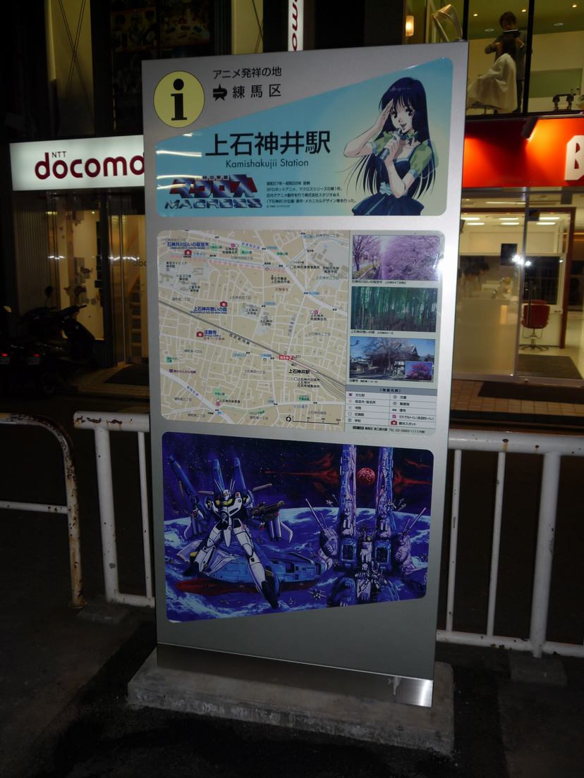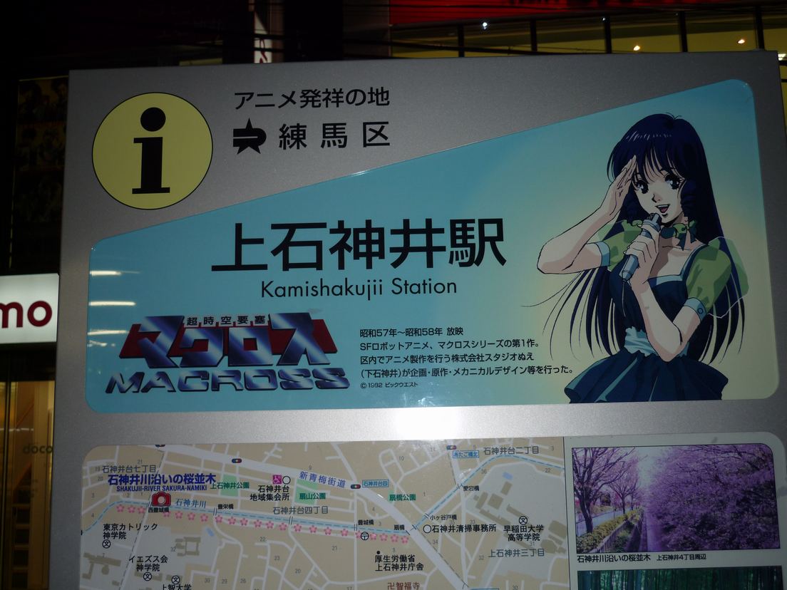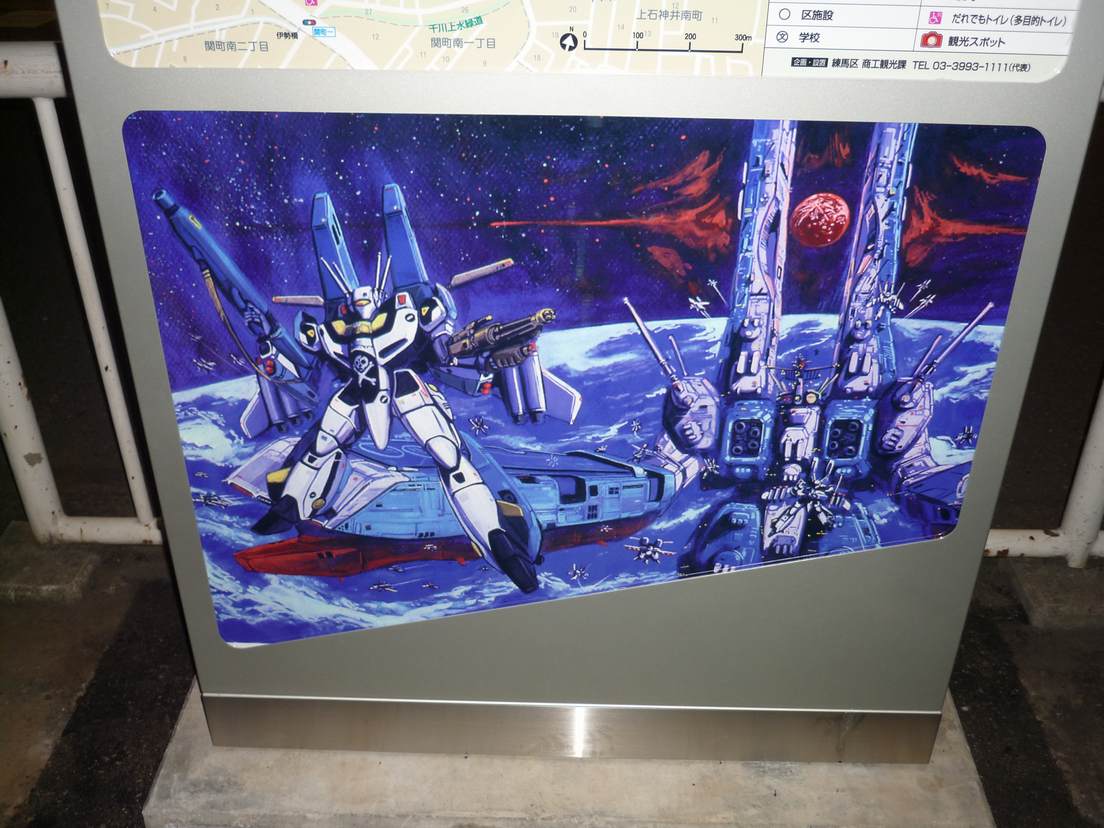 「超時空要塞マクロス」の観光案内版を見てきました。 上石神井を含む、練馬区は「アニメの発祥の地」らしく、さまざまなアニメ製作所が多く、数多くの 名作アニメが作られてきた場所でもあるそうです。 で、今、練馬区では西武線沿線のアニメ作品にゆかりの駅に、各作品の紹介の看板設置している らしく、そのひとつとして「超時空要塞マクロス」の観光案内版が4月あたりから登場したみたいです。 「超時空要塞マクロス」のネタで、マクロスFrontierの記事じゃないッス! つうことで、「超時空要塞マクロス」の観光案内版を見てきたので、ご紹介です。 西武鉄道といえば、上井草にサンライズがあるというのもあって上井草駅前にガンダム像が設置 されていますが、マクロスといえば”スタジオぬえ”。そのスタジオぬえがあるのが上石神井という ことで、上石神井駅に「超時空要塞マクロス」の観光案内版が設置されたみたいです。 で、設置されていた観光案内版がこちら。 設置されているのは、西武鉄道上石神井駅の北口。 「超時空要塞マクロス」の観光案内版に描かれているのは、丈夫に美樹本晴彦氏が描くリン・ ミンメイ、そして、下部に河森正治監督が描くVF-1Sとマクロスが描かれています。 あれ?VF-1S、ガンポッドとなんかガトリングガンみたいな武装を持っているんだけど・・・・。今さら、 新武装? ま、案内板ってことで、上井草のガンダム像みたいに堂々と設置されているわけでもなく、ポツンと 設置されています。しかも、駅前に出店しているパン屋?の車が立てている旗とかが邪魔して、 存在感がかなり薄くなっています。 普通に見つけられなかった・・・。 ということで、遠いところは行く訴求力があるようなモノではありませんが、お近くにお住まいの方は 見に行って見てください。 [関連記事] ピュアなフリして、ギラギラサマー(^ω^)'/ 大決起集会「ギラサマ祭」開催決定 マクロスFrontier ギャラリー展をやってる「ufotable cafe」にいってきた 「クランクランに負けないぞ!」 ミリア・パチンコ屋来店 レポ マクロスFFC「F魂」会報 でかるちゃぁ☆ no.2 レビュー マクロスFFC「F魂」会報 でかるちゃぁ☆ no.1創刊号 レビュー パチンコ雑誌できゃんちがリン・ミンメイのコスプレ! 劇場版マクロスFrontier -イツワリノウタヒメ- 舞台挨拶 感想&レポート 劇場版マクロスF~イツワリノウタヒメ~の痛電車が運行を開始! らき☆すた4コマも掲載! マクロスA(エース) Vol.003 レビュー マクロスA(エース) Vol.002 レビュー&劇場版公開日&副題決定!! マクロスA(エース) Vol.001 ついに発売!! 全部見せちゃうからね! 劇場版マクロスFガイドブック レビュー 「FEVER超時空要塞マクロス」新機種発表会 レポート マクロスクロスオーバーライブ翌日にF魂からの贈りモノ マクロスクロスオーバーライブ -会場の様子- マクロスクロスオーバーライブ -コスプレ彼女- マクロスクロスオーバーライブ -ライブ・レポート- 千円でシェリルをお持ち帰り「VISUAL COLLECTION シェリル・ノーム」 劇場版マクロスF・ヒロインの新コスチューム、キタ━(゚(゚∀゚)∀゚)━!! 瞬殺、再び!アキバでは、1日持たず「一番くじ らき☆すた×マクロスF」 「アドレな!ガレッジ」のアシスタントのシェリルコスがかわぃぃ 「マクロス クロスオーバー ライブ」チケット当選だじぇー TAMASHII NATION 2009 -マクロスF トークショー- マクロス超時空進宙式典 -会場の様子- マクロス超時空進宙式典 -会場前の展示物- マクロス超時空進宙式典 -会場にいたコスプレ彼女- マクロス超時空進宙式典 -会場にあった痛車- マクロス超時空進宙式典 -超時空トークショー Aパート- マクロス超時空進宙式典 -超時空トークショー Bパート- マクロス超時空進宙式典 -超時空進宙式典- マクロスファンの皆さん、ゴメン!大山総帥が降臨した マクロス超時空進宙式典 スタンプラリーレポ&抽選結果報告 マクロス超時空進宙式典 スタンプラリー in アキバ みんなの声を作品にする、それがTMA!!超時空コスプレ作品登場 『セーフティードライブ キャンペーン in 海ほたる』 ポスターGETだぜっ! 「娘たま♀」発売!ドキッ!!ウタモノだらけのマクロスソングの集大成 マクロスFRONTIER OST2「娘トラ☆」ヤックゼントラ盛り マクロスFRONTIER OST「娘(ニャン)フロ1」ゼントラ盛に感動 マクロスFRONTIER 第25話「アナタノオト」 レビュー マクロスFRONTIER 第24話「ラスト・フロンティア」 レビュー マクロスFRONTIER 第23話「トゥルー・ビギン」 レビュー マクロスFRONTIER 第22話「ノーザン・クロス」 レビュー マクロスFRONTIER 第21話「蒼のエーテル」 レビュー マクロスFRONTIER 第20話「ダイアモンド・クレバス」 レビュー マクロスFRONTIER 第19話「トライアングラー」 レビュー マクロスFRONTIER 第18話「フォールド・フェーム」 レビュー マクロスFRONTIER 第17話「グッバイ・シスター」 レビュー マクロスFRONTIER 第16話「ランカ・アタック」 レビュー マクロスFRONTIER 第15話「ロスト・ピース」 レビュー マクロスFRONTIER 第14話「マザー