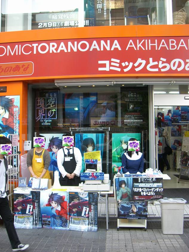 諸事情で会社を休んでアキバに行ってみたら、5月20日発売された「空の境界 俯瞰風景」 DVDが発売されており、この日の各店舗の販売風景を見て来ました。 ちなみにFate/stayNightが好きで奈須きのこ作品ということで一度は読んでいるのですが、 なかなかダークネスで面白かったのですが、DVDを購入してまでといった感じを持っていました。 もちろん、劇場版も観ていません。(観たいとは、思うんですけど・・・まぁ、全話が出揃ったら 観てみたい、と思います) ということで、「空の境界 俯瞰風景」が発売された5月21日のアキバの様子をご紹介します。