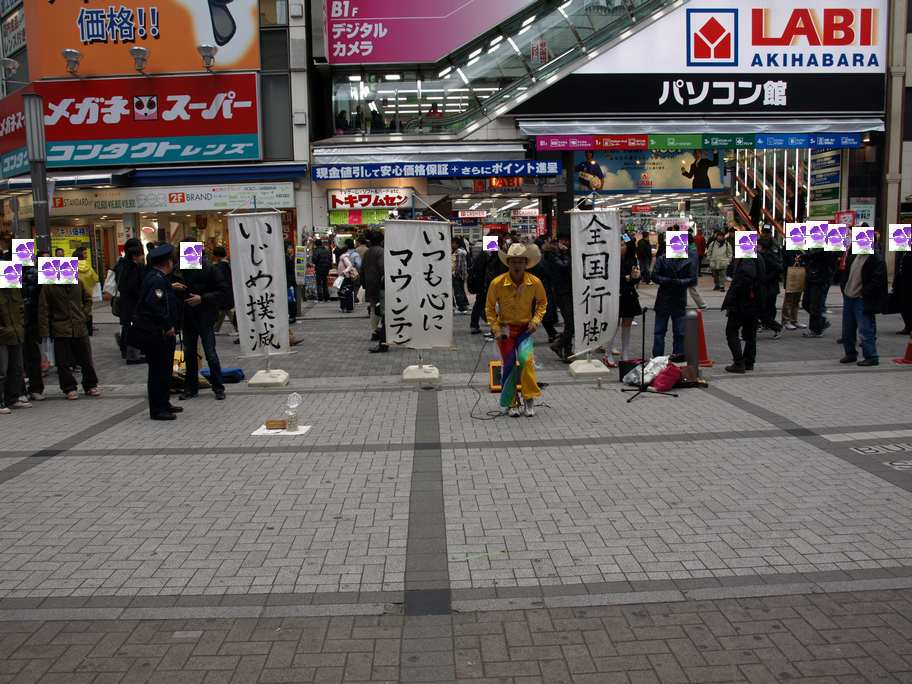 少なく、あまり話題性に乏しい一日でした。しかし、唯一、盛り上がったというか、JR秋葉原駅前 で人を多く集めていたパフォーマーがいらっしゃいました。 「全国行脚」 「いつも心にマウンテン」 「いじめ撲滅」 解読レベルが高すぎる旗をバックに歌う”登天ポール”(とうてんぽーる)さんがかなり理解不能 な電波ソングを歌っていました。