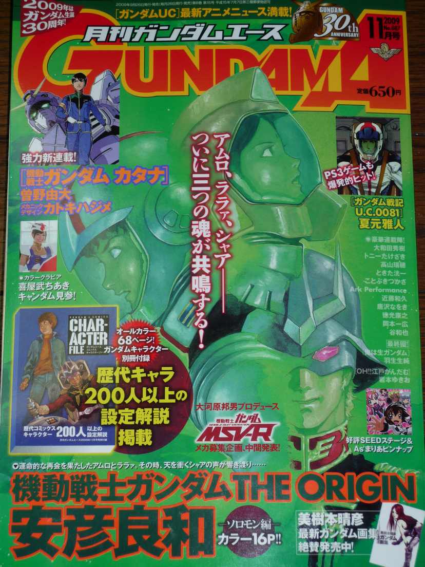 いやはや、8月に機動戦士ガンダムUCのスタッフや概要が発表されて、いやがおうでもガンダム オタクの期待が膨らむ一方なわけですが、今月号にももちろんユニコーンガンダムの最新情報が ギッシリ! 8月の一大イベント「GUNDAM BIG EXPO」が終わり、生誕30周年を迎えてるこの年もこれで ひと段落!と思ったら大間違い!!10月にはガンダムオタクとして、絶対に参加しなければならない 「Soul-G」が待っています!まだまだ、ガンダムオタクとしてゆっくりとはしていられませんね! 30周年を楽しむイベントが残っているってだけで、心踊りまくり! つうことで、そんなヘヴン状態をさらにヘヴンにさせてくれる加速装置がガンダムエース。今月号も ガンダムオタクを納得させてくれる情報が目白押しです! つうことで、「ガンダムエース 11月号」をご紹介します。