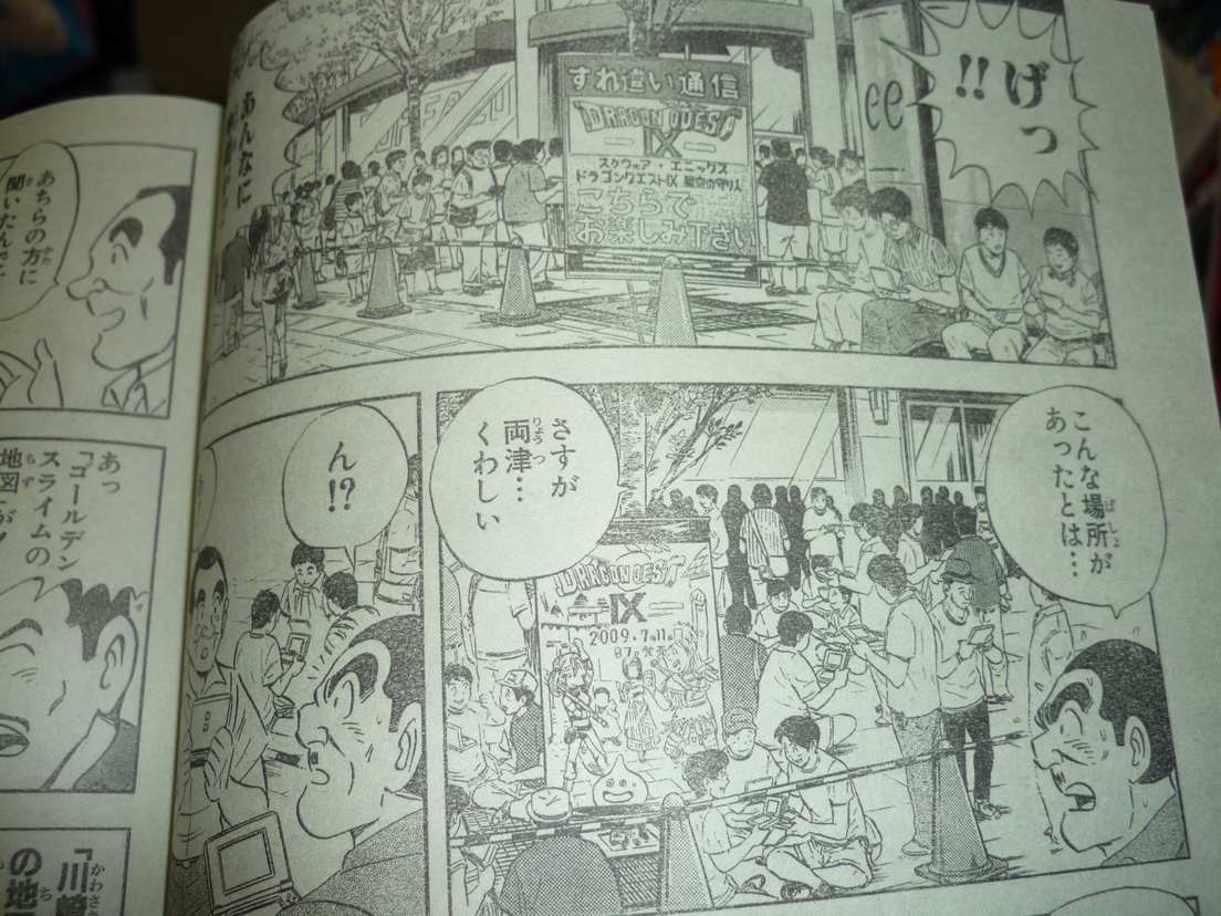 ゲームショーでも会場は、すれ違い通信を行う人々でごった返していましたが、そんなすれ違い 通信ブームの勢いは、ブームメントやサブカルチャーを取上げることの多い「こちら葛飾区亀有 公園前派出所」で、今週のジャンプで取上げられていました。 本日のゲームショー、あちらこちらでDSをプレイしている方が多く、人の流れがない階段や会場 の隅で驚くぐらいの人がいました。(スクエニのブースで先行で配信されるデータがあったみたい) そんな、勢いのあるドラクエのすれ違い通信がとうとう、両さんに取上げられるまでに。そして、 夏休みだけかと思っていた秋葉原のヨドバシAkibaにある「ルイーダの酒場」も取上げられて いました。