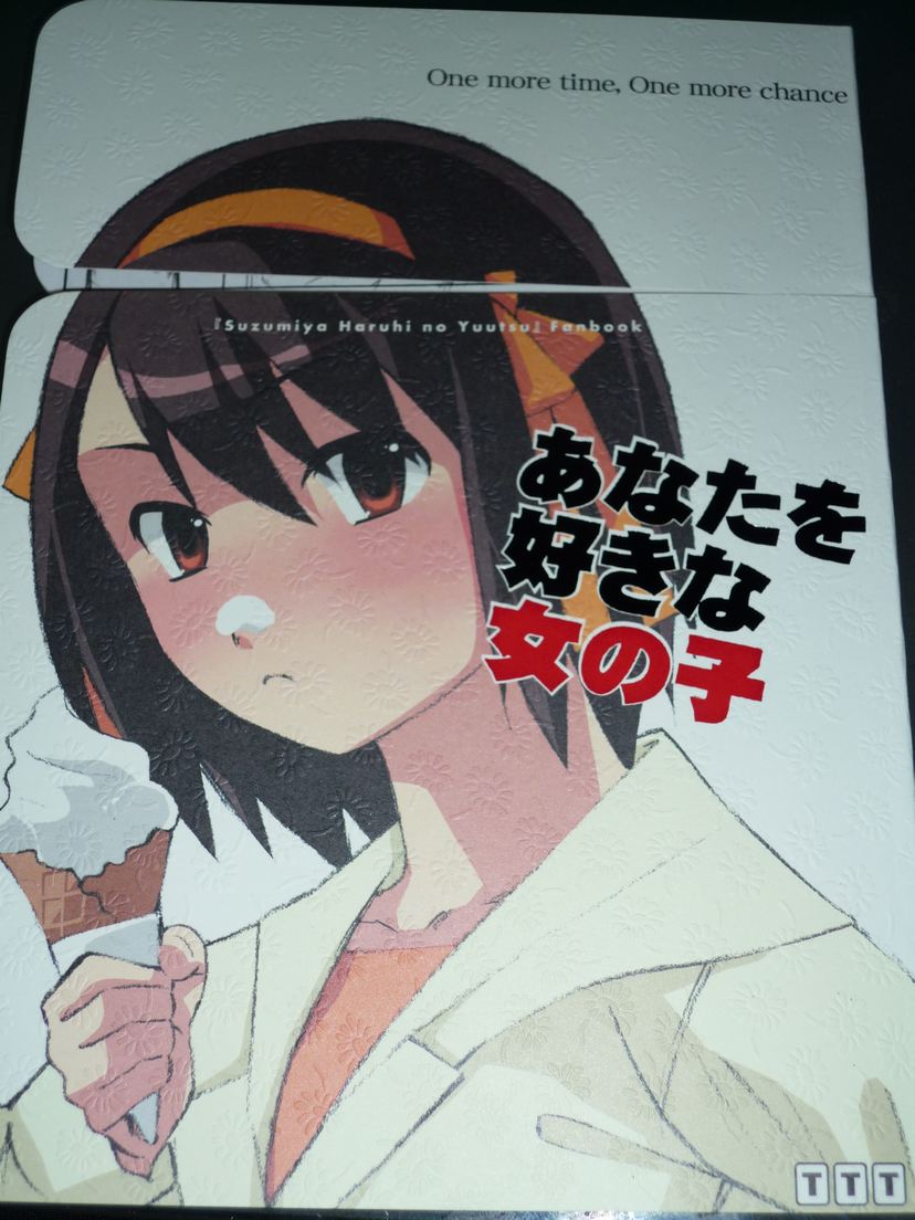 の頒布元のサークル’TTT’さんのコミケ76新刊「あなたを好きな女の子」が発売されてました! あの涼宮ハルヒの気持ちイイぐらいのツンデレっぷりと、「くっ、くさっ」と思えるようなイチャイチャ 展開で読んだ人たちの心をモヤモヤさせた「ハルヒかわいい」シリーズですが、「ハルヒかわいい3」 で最終刊と告知されていたので、スッゴイ残念で続編を希望していたんですが・・・。 「ハルヒかわいい」のテイストそのままに満を持して「アナタの好きな女の子」がコミケ76で頒布 されたみたいです。 ということで、買ってきました!つか、待ってました!! 今回もキュンキュンするようなハルヒのイチャイチャっぷりは、・・・・・タマンネ。 ということで「アナタの好きな女の子」をレビューします。