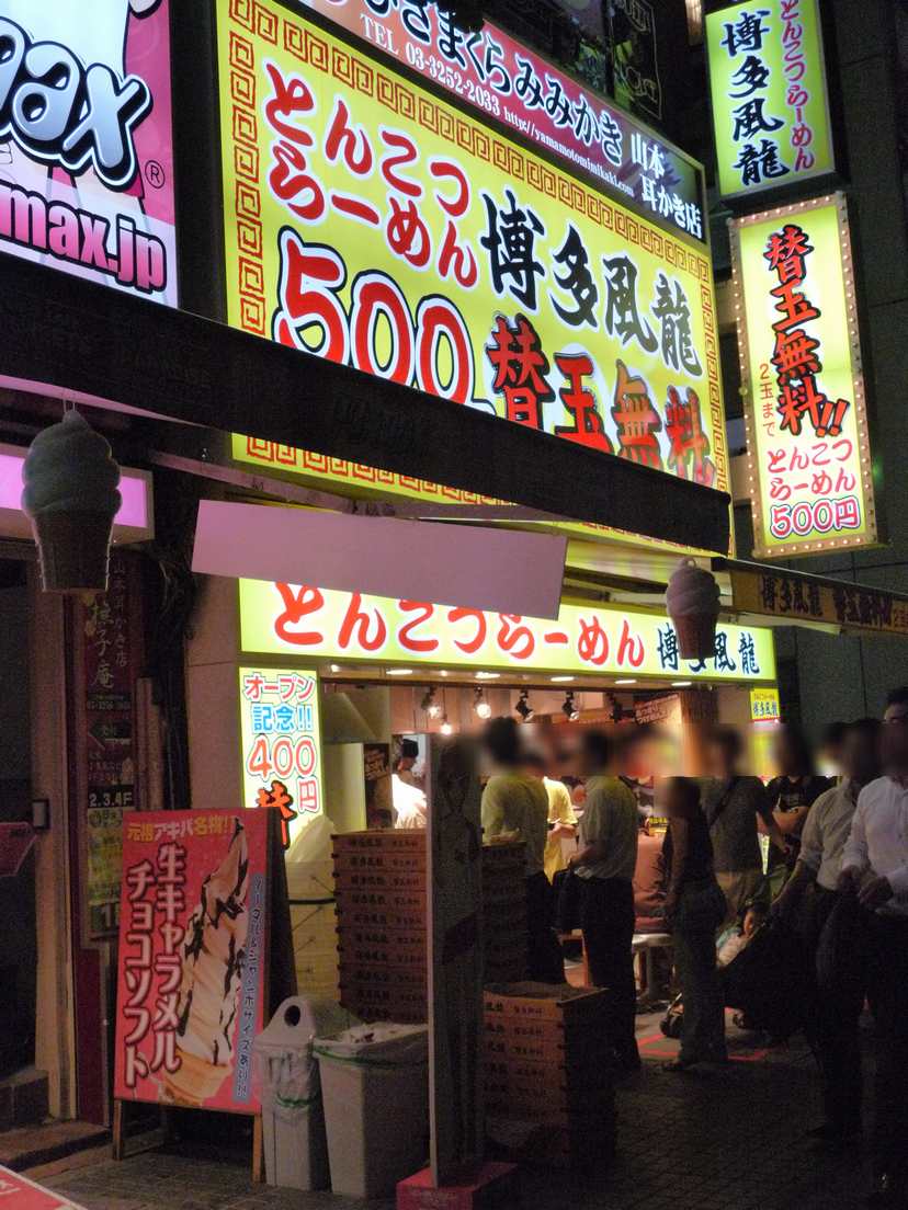 なんといっても”食事事情”。一昔前の秋葉原では、食事場所が極端に少なく、食事どころが少ないの に秋葉原に来る人間は多い、需要と供給がまったくつりあってなかったことはアキバ通の方なら 誰もが納得してくれると思います。 しかし、近年はアキバの観光地が進み、注目度が上がれば上がるほどアキバの食事事情も大きく 改善されて、今では食べるところに悩んでしまうぐらいに多くの飲食店が乱立しています。 そんな中、乱立するがゆえになかなか飲食店が定着しない店舗というのがあります。 今回、ご紹介するのは過去に「ドラゴンアイス」や「沖縄そばの店まーさぬやー」があったAKIBA タワーの1Fに出来たとんこつらーめんのお店「博多風龍 秋葉原店」です。 まぁ、並んでいたからいって見たって感じなんですが・・・・、激しく笑いそうになりました。つか、 久しぶりに食事の感想以外にネタ的な意味で。