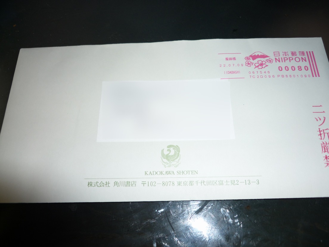 イイながら帰宅したら、ポストに角川書店から封筒が送られてきてました。 はて、角川書店さんが私に何を送りつけてきたんだ? ま、まさかアサガヲBlogに対するクレームか?と思ったけど、こんなチンカ○ブログにいちいち、 天下の角川書店さんがクレームを付けるわけないし、眼中にすら入ってないだろうし・・・。 と、宛名を良く見てみたら管理にの本名で送られてきているので、アサガヲBlogはまったく 関係ない、と理解。 以前にも言ったとおり、アサガヲBlogの管理人は、比較的にネタな方向で運がいいです。 つまり、なんか角川書店さんのなんかの懸賞が当選したみたいです。