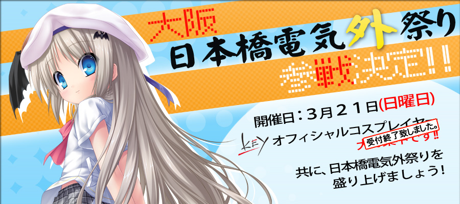 とりあえず、本日、大阪・日本橋で開催された「日本橋ストリートフェスタ2010」の取材を無事、 終了することが出来ました。 本当言うと、3月20日に開催された「クィーンズブレイドファンミーティング」を取材する予定で 土曜の夜から大阪に出発する予定だったのですが、今回の関西遠征の本当の目的である祖母 との面会が病院の都合で日程が急に変更となってしまい、土曜日に大阪に行かなければいけなく なってしまい、かなりのハードスケジュールの中で関西取材になってしまいました 「クィーンズブレイドファンミーティング」には、コスプレイヤーさんも登場すると聞いていたので すっごい、後ろ髪を引かれる思いだったんですが・・・・。、残念です。 で、とりあえず、本日の日本橋ストリートフェスタの取材で連荘イベント取材が一息ついたので、 掲載するイベント取材記事を掲載しておきたい、と思います。