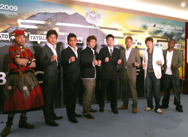 決まりました!! 2月23日(月)に東京・国立代々木競技場第一体育館で開催される「K-1 WORLD MAX2009 ~日本代表決定トーナメント~」に出場が決まっており、本日、港区白金にある八芳園にて トーナメント戦の抽選会が行われました!! 今回、このトーナメントに参戦する選手は8名。 城戸康裕、小比類巻太信、アンディ・オロゴン、HAYATO、日菜太、TATSUJI、山本優弥、そして、 長島☆自演乙☆雄一郎選手です。 私が知っているのは、ボビー・オロゴンの弟・アンディ、魔沙斗の元ライバル・小比類巻ぐらい。 そして、その8人が並ぶ写真がこちら!!乙くん、やってくれました!!! 冬コミでも披露してくれていた、”乙君の嫁”こと、リリカルなのはのヴィータコス!! <スポーツナビより拝借>