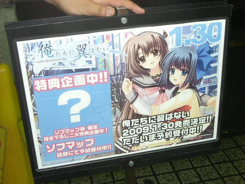 最近、金曜の夜は、仕事をチャッチャと切り上げて(なんか、ダメ社員ぽく思われそうですが・・・) アキバに行くようにしています。アキバの金曜の夜は、痛車だったりオモシロPOPだったり色々と 見つけることが出来るんですが、この日もソフマップ・AM館でコスプレ彼女さんを見つけることが 出来ました。 夜7時ごろ、ソフマップAM館の店頭でチラシを配ってるのを発見。 何のチラシかと思ったら、2009年1月20日にNavelより発売されるエロゲ「俺たちに翼はない」の 予約キャンペーンが開始されたキャラバンイベントが行われていました。 ということで、ソフマップ・AM館店頭でチラシを配っていらしゃったコスプレ彼女さんをご紹介します。 (スタッフの方・コスプレ彼女さんには撮影の許可を頂いております)