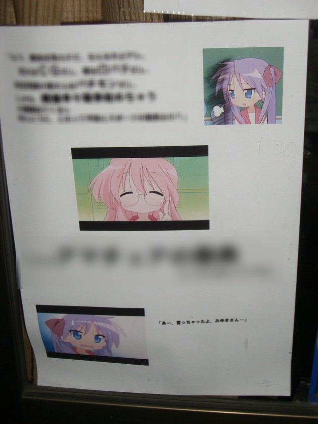 いました。 ジャンクショップ”TAIRYO(大漁)”は、IOSYS(イオシス)、メディオと並ぶ店頭おもしろPOP名所で あり、アキバによく通う人間の巡礼ポイントになっているとか、なっていないとか。 以前は、私もこの3店舗はアキバに行ったら必ず回る巡回ポイントだったのですが、ジャンクショップ ”TAIRYO(大漁)”は、今年の1月あたりを最後にPOPの掲載がなくなっていました。 たまーに寄っていたのですが、いつの間にか新しい”毒づくPOP”が店頭に掲載されていました。 復活した”毒づくPOP”は、先日閉会した北京五輪をらき☆すたのみゆきさんとかがみが毒づいて います。 |