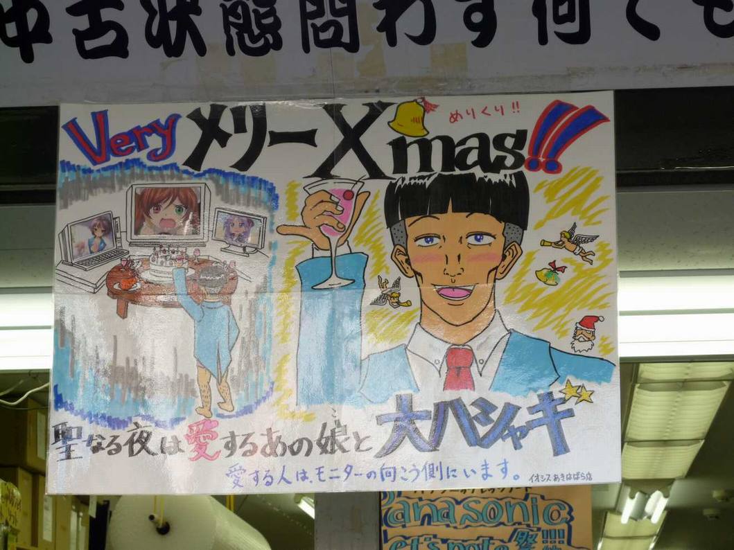 過ごす予定です!! そんな性の匂いがプンプンするクリスマス・イヴを正しく過ごそうとする人が少ない中、オモシロ PCショップ・IOSYSの店員は今年もオタクとして いらっしゃいました。 昨年は、ローゼンメイデン・翠星石と思われる壁紙を目の前にターキーとシャンパンとケーキを 用意して、クリスマスイヴを二人?で過ごしたIOSYSの店員ですが、今年はIOSYSで特価で 販売されているディスプレイを3台導入して、3人の嫁と過ごすみたい。 勇者IOSYSの店員の過ごした方を宣言する店頭POPがこちら。